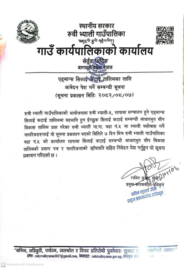 एड्भान्स सिलाई कटाई तालिमका लागि आवेदन पेश गर्ने सम्बन्धी सूचना !!!